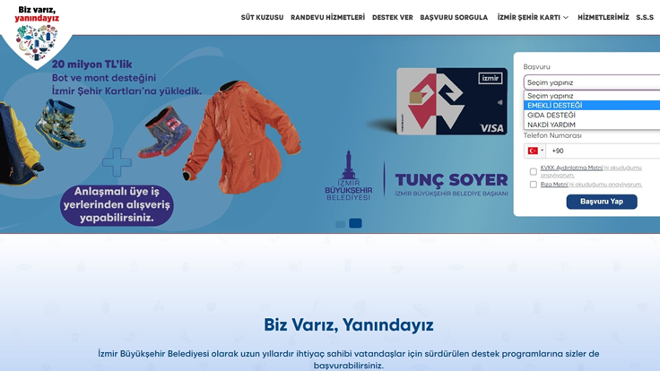 İzmir Büyükşehir Belediyesi’nin dayanışmayı büyütmek için hizmete sunduğu bizvariz.izmir.bel.tr adresi üzerinden, “Başvuru” başlığından “Emekli Desteği” kısmını seçen emekli yurttaşlar kendilerine ait bilgi ve belgeleri sisteme yükleyecek. Sosyal Hizmetler Dairesi Başkanlığı bünyesinde çalışan uzman ekipler, sosyal yardım kriterine uyan yurttaşları tespit ederek bilgilendirecek.