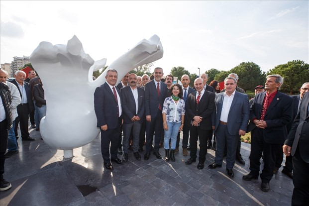 Konuşmaların ardından heykel alkışlar eşliğinde açıldı. Her köşesinde ayrı bir anlam ve öğreti taşıyan heykel düzenlemesini yakından inceleyen Başkan Soyer, heykelin mimarı Esen Keçecioğlu’na teşekkür etti.