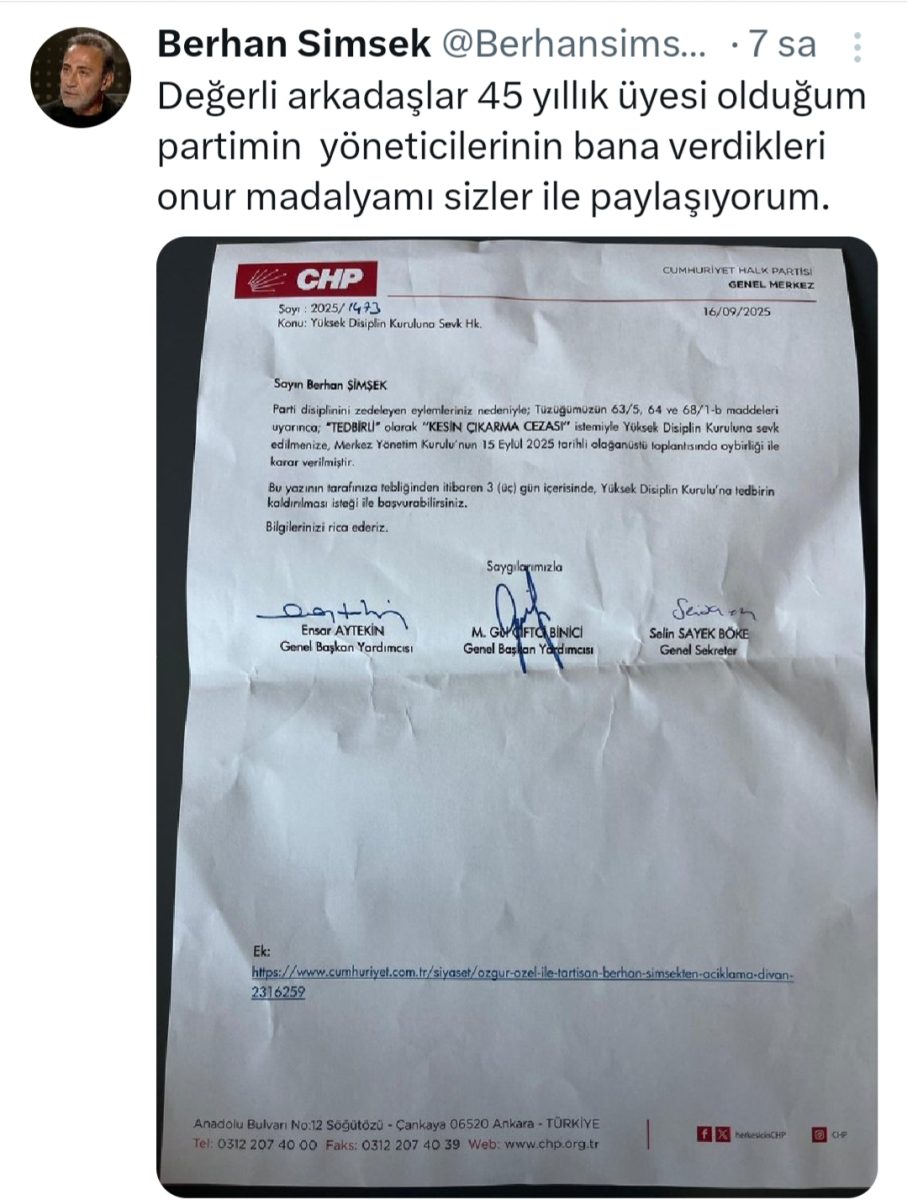 Berhan Şimşek’in durumu, sadece bir disiplin meselesi değil; aynı zamanda CHP’nin kendi değerlerine, emektarlarına ve hafızasına ne ölçüde sahip çıktığının bir göstergesi olarak yorumlanıyor.