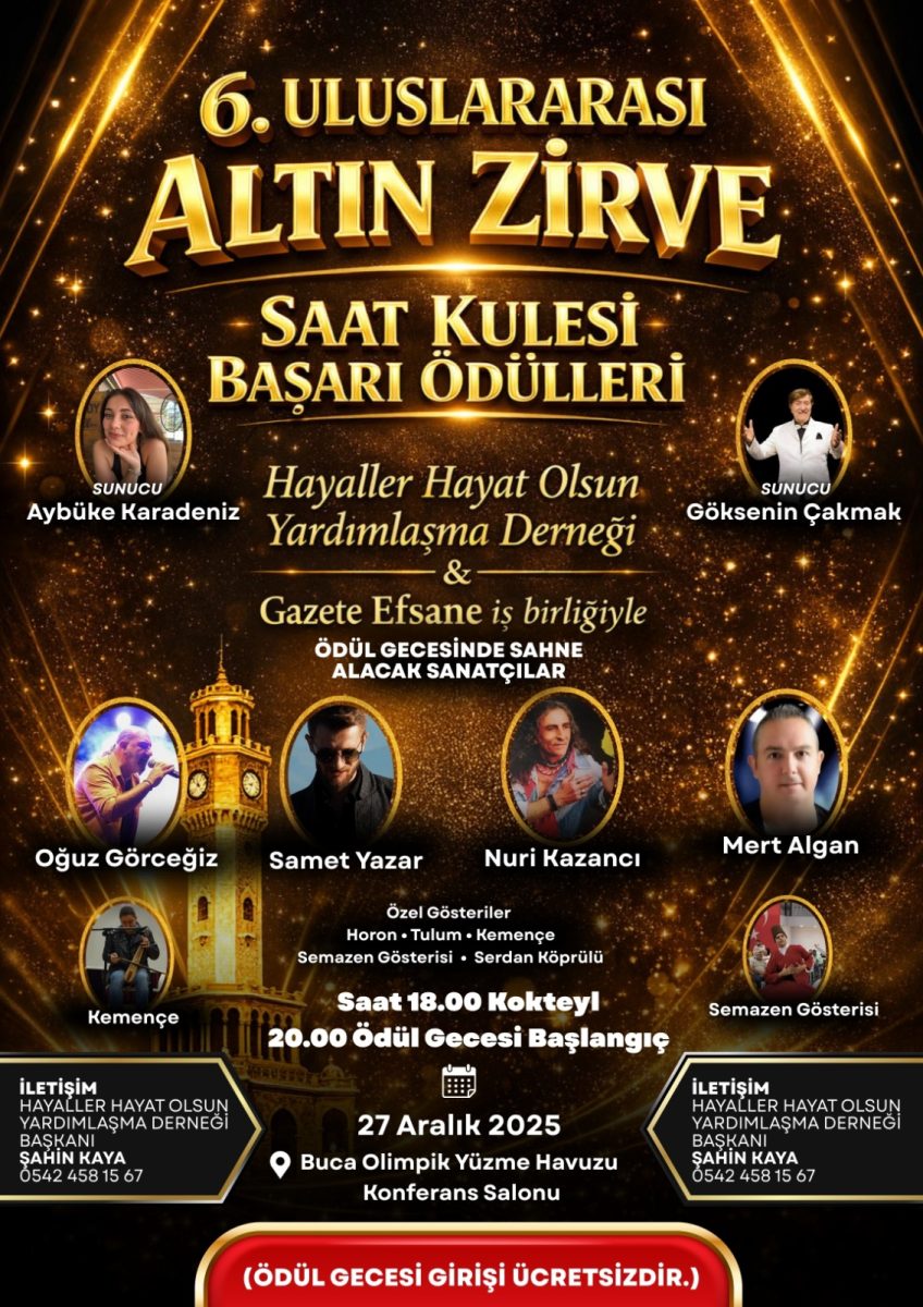 Hayaller Hayat Olsun Yardımlaşma Derneği ile Gazete Efsane iş birliğinde düzenlenen 6. Uluslararası Altın Zirve Saat Kulesi Başarı Ödülleri, bu yıl da iyiliği, başarıyı ve toplumsal dayanışmayı bir araya getiriyor. Büyük bir ilgiyle beklenen organizasyon, sanat, siyaset, bürokrasi ve sivil toplum dünyasını aynı çatı altında buluşturacak.