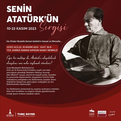 İzmir Büyükşehir Belediyesi, Ahmed Adnan Saygun Sanat Merkezi’nde İzmirlilerin Ata’sına yazdığı mektuplardan oluşan “Senin Atatürk’ün Sergisi”ne ev sahipliği yapacak.  Kent Arşivi, Müzeler ve Kütüphaneler Şube Müdürlüğü’nün 2022 yılının 10 Kasım haftasında düzenlediği “Atatürk’e Mektup Yazmak İster Misiniz” etkinliğine katılan İzmirlilerin mektuplarından oluşan sergi 10 Kasım Cuma günü saat 18.15’de sanatseverlerle buluşacak. Sergi 23 Kasım tarihine kadar ziyaret edilebilecek.
