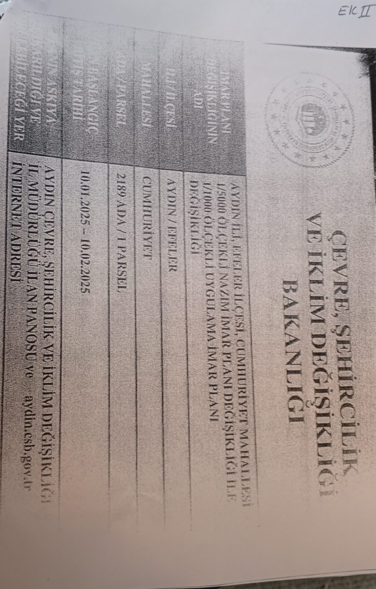 Aydın İli, Efeler İlçesi, Cumhuriyet Mahallesi tapunun 2189 ada 1 parselinde kayıtlı arsa vasıflı taşınmazda 1/5000 ölçekli nazım imar planı ile 1/1000 ölçekli uygulama imar planı değişikliği yapılması ile ilgili olarak 10.01.2025 tarihinde ilan edilmiş olup, 1/5000 ve 1/1000 ölçekli imar planlarında ORMAN FİDANLIĞI olarak geçmektedir. Plan değişikliği ile Adliye Binası yapılmak istenmektedir.