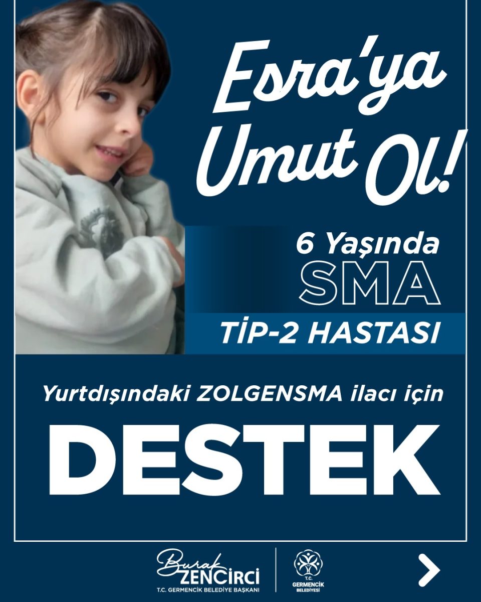 Germencik Belediye Başkanı Burak Zencirci, SMA Tip 2 hastalığıyla mücadele eden 6 yaşındaki Esra Alkan’ı makamında ağırladı. Tedavisi için gerekli olan Zolgensma ilacına kavuşabilmek adına destek talebinde bulunan minik Esra’nın bağış kampanyası şu anda yüzde 54 seviyesinde bulunuyor.