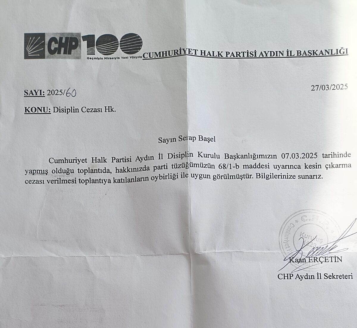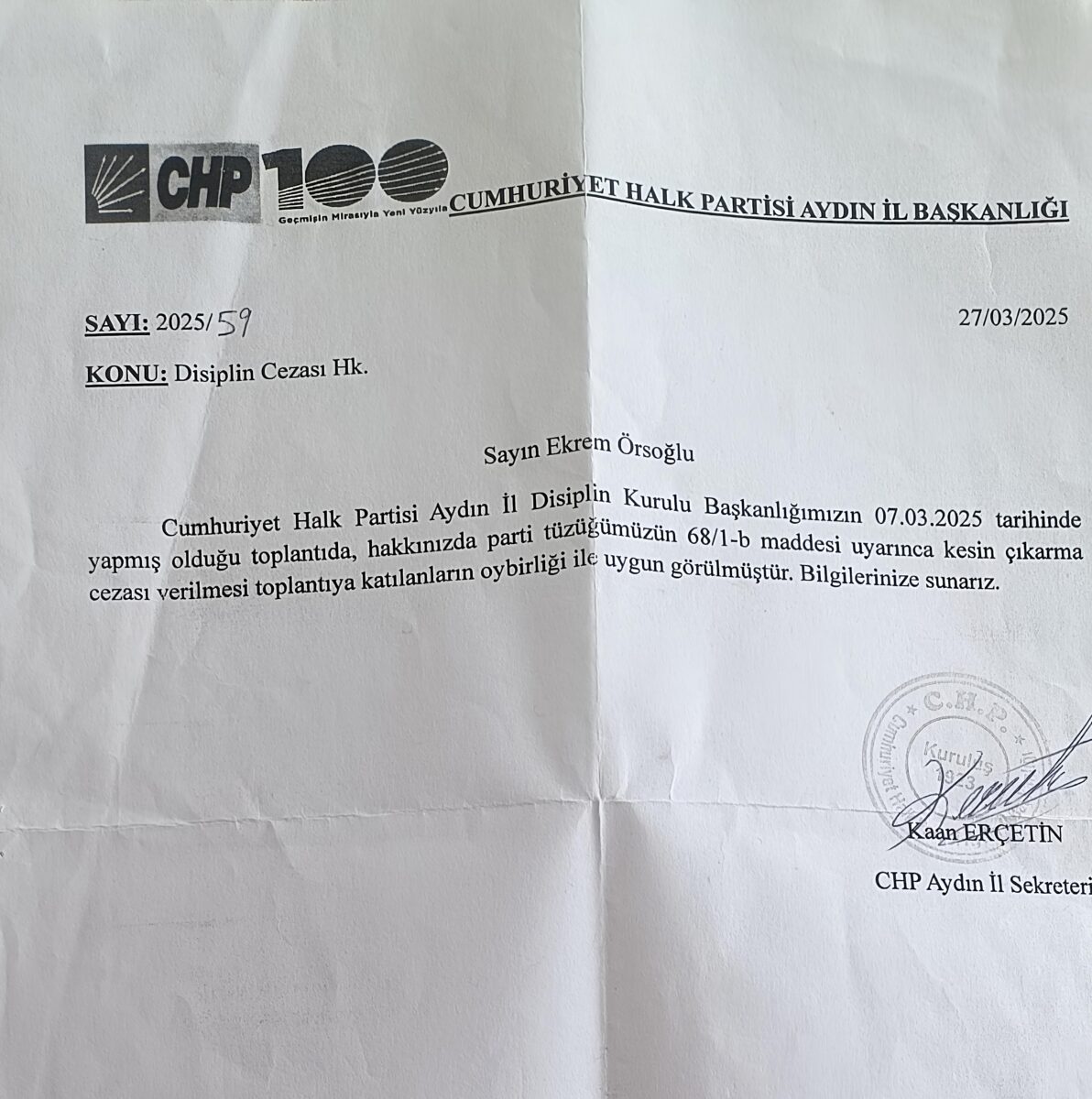 Doğal olarak, dönemin Aydın İl Sekreteri, bugün CHP Efeler İlçe Başkanı olan Kaan Erçetin’i aradı.