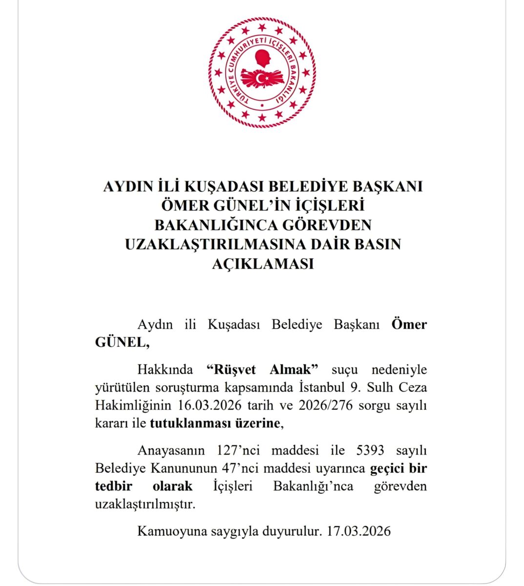 Kuşadası Belediye Başkanı hakkında “rüşvet almak” suçlamasıyla yürütülen soruşturma kapsamında tutuklama kararı verilmiş ve görevden uzaklaştırılmış.