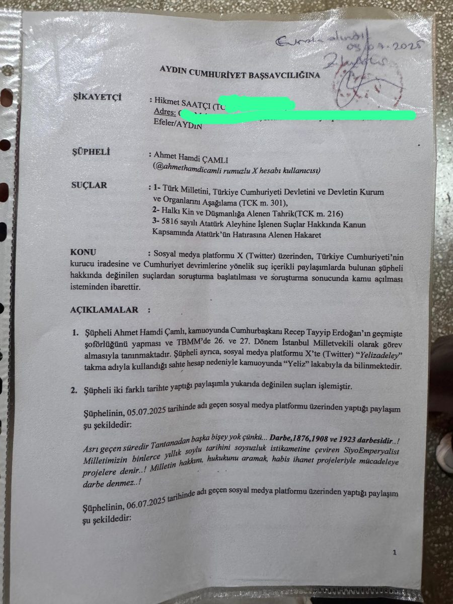 Türkiye Cumhuriyeti’ne ve cumhuriyetimizin kurucusu Gazi Mustafa Kemal Atatürk’e hakaret eden; kamuoyunda ‘Yeliz’ lakabıyla bilinen AKP önceki dönem Milletvekili Ahmet Hamdi Çamlı hakkında Aydın Cumhuriyet Başsavcılığı’na suç duyurusunda bulunduk.
