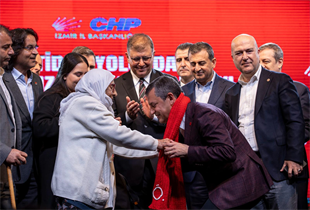 Programın sonunda CHP İzmir İl Örgütü’nün en yaşlı üyesi olan 106 yaşındaki Nuriye Koç, CHP Genel Başkanı Özgür Özel için ördüğü atkıyı sahnede takdim etti.