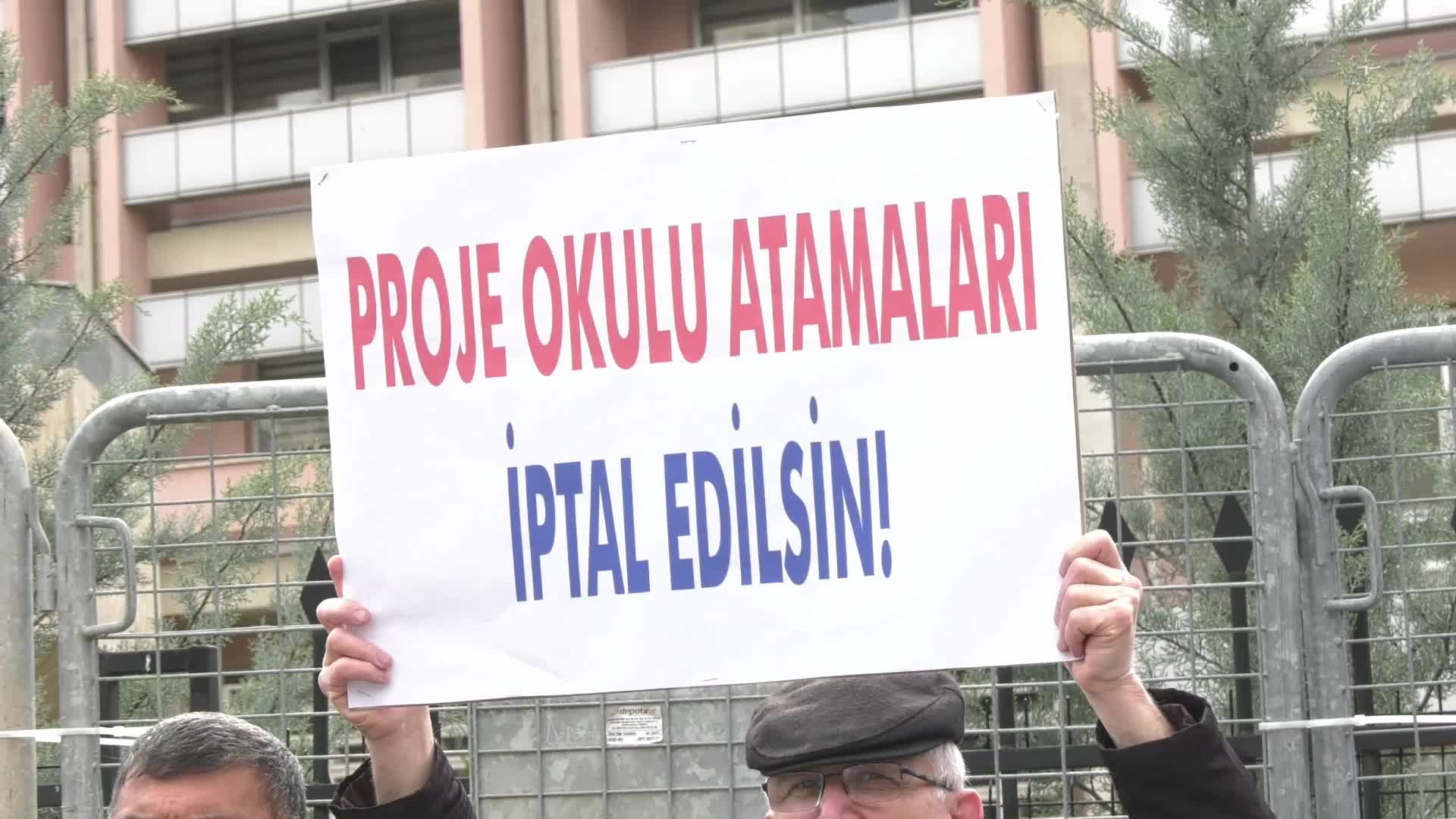 Eğitim Sen üyeleri, “Atama değil, öğretmen kıyımı”, “Proje okulu atamaları iptal edilsin”, “Liyakat ve adalet istiyoruz” yazılı pankartları taşıdı.