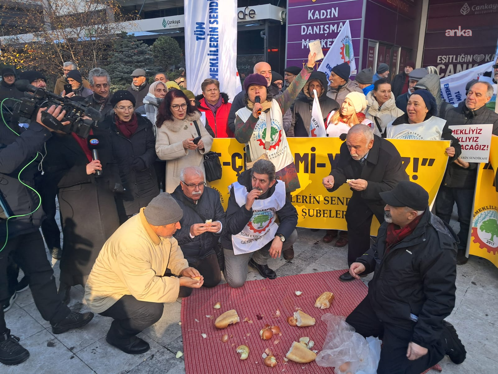 (ANKARA) – Tüm Emeklilerin Sendikası Ankara Şubeleri, 2026’nın ilk yarısında emeklilere yapılması planlanan zam oranlarını protesto etmek için Sakarya Caddesi’nde açıklama yaptı; emekliler, artan hayat pahalılığına dikkat çekmek amacıyla basın açıklamasının ardından kuru soğan ve ekmek yiyerek geçim sıkıntısına tepki gösterdi.