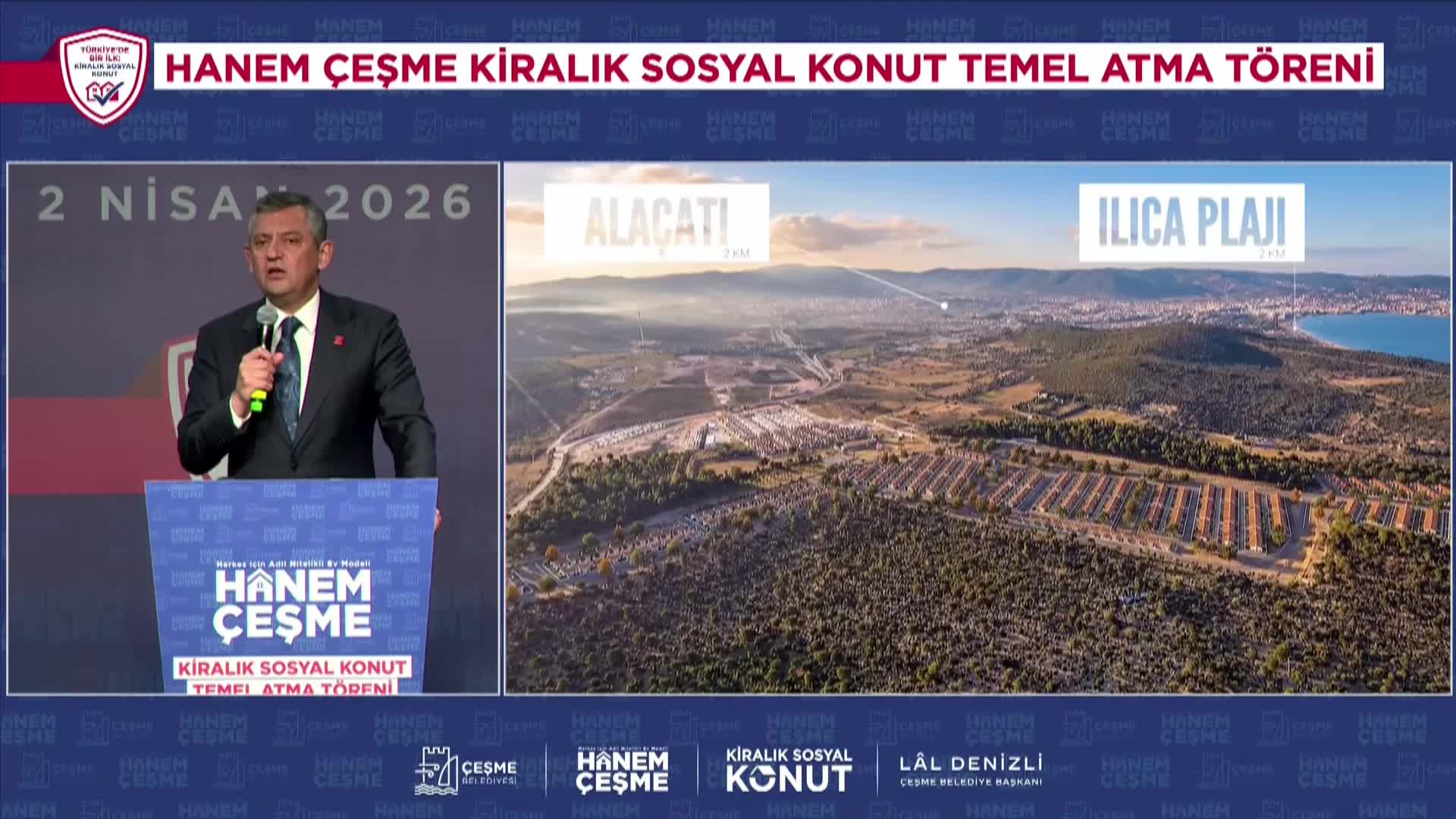 CHP Genel Başkanı Özgür Özel, İzmir’in Çeşme ilçesinde Çeşme Belediyesi tarafından gerçekleştirilen Hanem Çeşme Kiralık Sosyal Konut Projesi’nin temel atma törenine katıldı. törende konuşma yapan Özel, “Biz bugün burada bir temel atma gerçekleştiriyoruz. Projenin adı: Hanem Çeşme Projesi. Hanem Çeşme, ‘Herkes için adil nitelikte ev modeli’ kelimelerinin baş harflerinden oluşuyor. Projenin, bir sözlü önerge arz edeceğim müsaadenizle Sayın Genel Başkanım. Projenin bundan sonraki adının, ‘Herkese adil nitelikli ev modeli’ olmasını alkışlarınızla onayınıza sunuyorum” dedi.