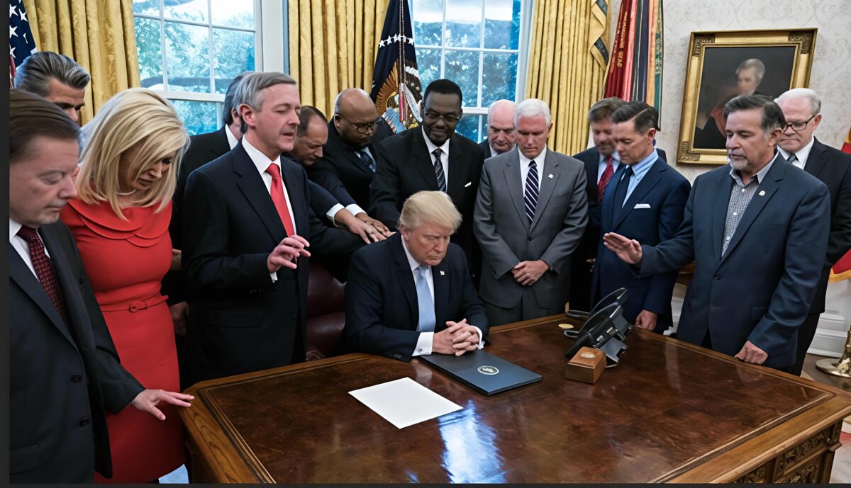 Savaş 7. Gününü geride bırakırken Beyaz Saray’dan servis edilen bir fotoğraf olayın iğrenç boyutunu tüm dünyaya sergiledi. Trump’ın etrafında toplanan Evangelist papazlar ona dokunup dua ediyorlardı.