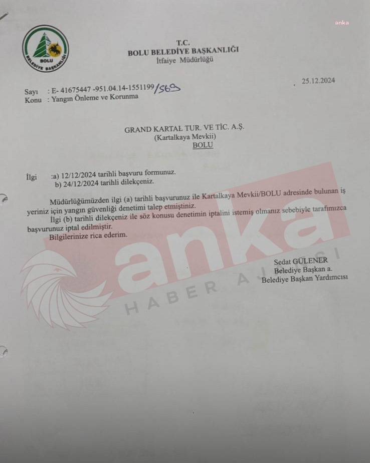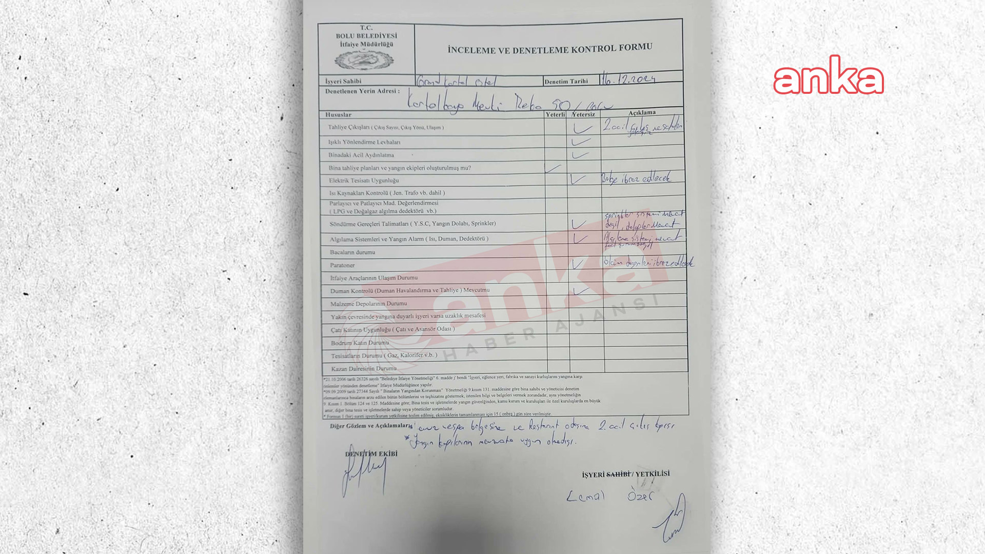 ANKA Haber Ajansı’nın ulaştığı belgelere göre Otel, 12 Aralık 2024 günü Belediye’den denetim talep etti. Bunun üzerine Bolu Belediyesi İtfaiye Müdürlüğü’nün inceleme ve denetlemelerde bulundu. 16 Aralık 2024 günü denetim üzerine hazırlanan formda 19 konu başlığının 8’inde tesisin yangın yönünden yetersiz olunduğuna dair tespitler yer aldı.