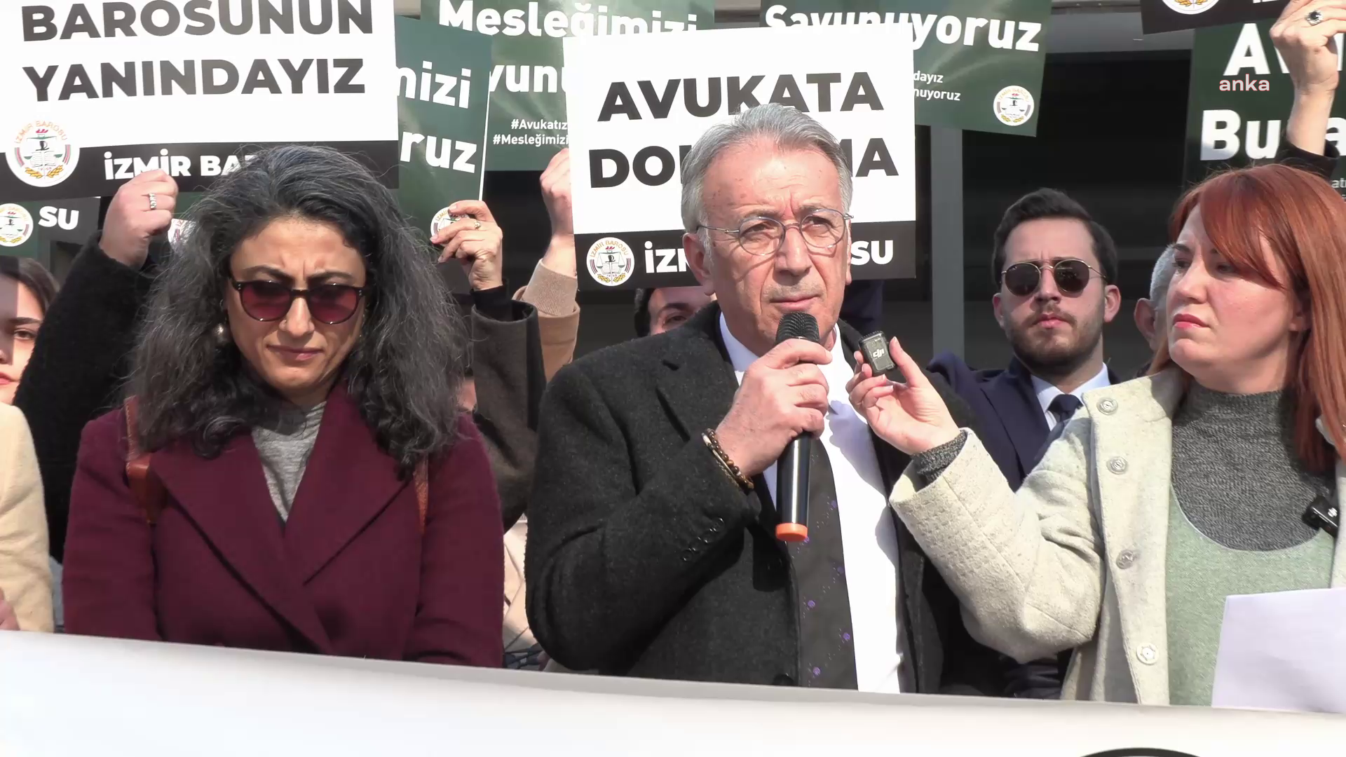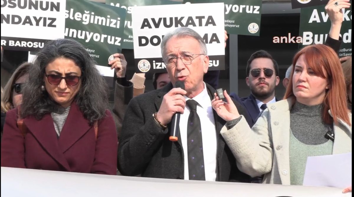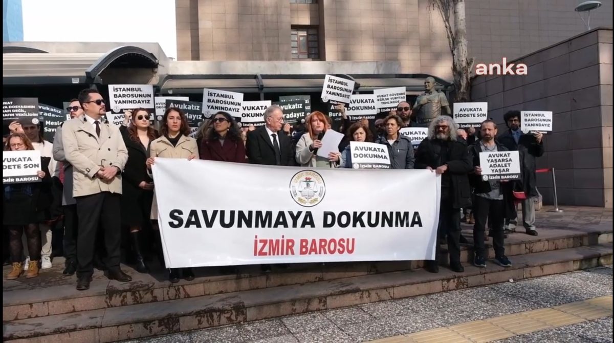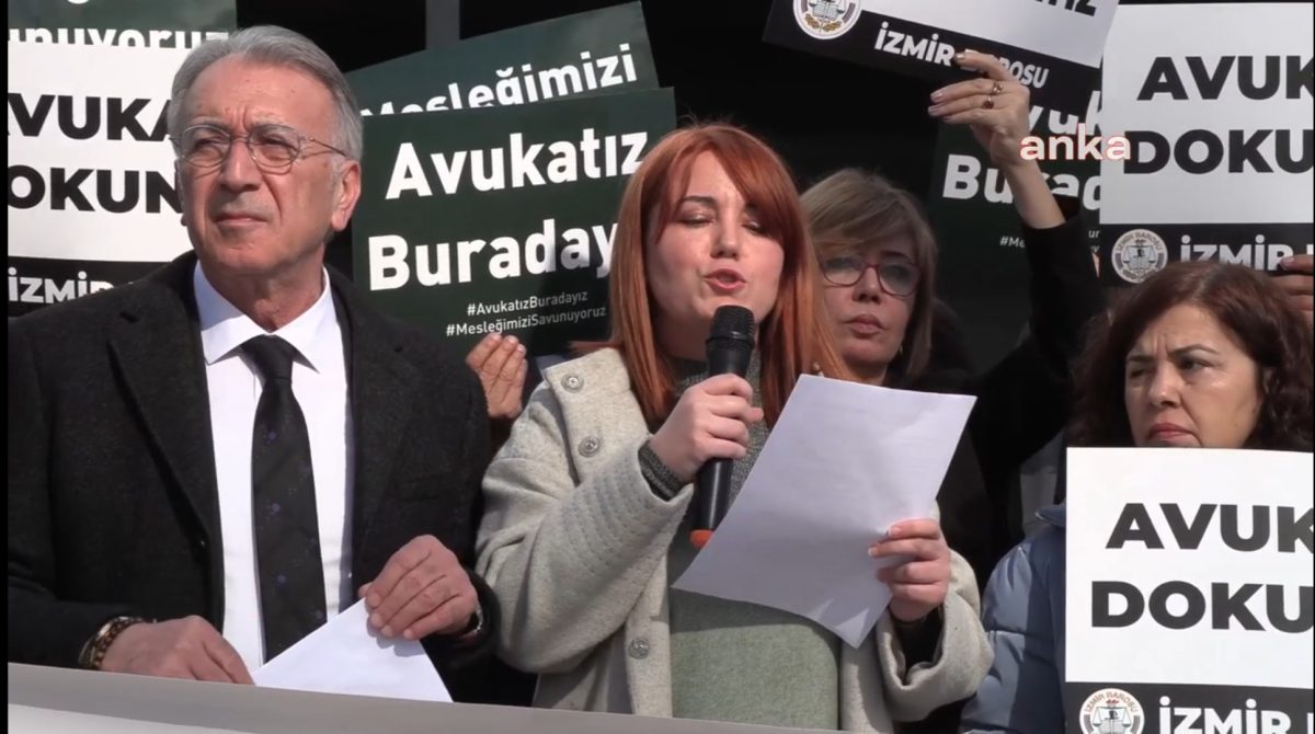 İzmir Barosu adına basın metnini İzmir Barosu Avukat Hakları Merkezi’nden sorumlu Yönetim Kurulu Üyesi Av. Gamze Şimşek okurken İzmir Barosu Başkanı Sefa Yılmaz, ülkede hukuk ve yargı sisteminin üzerindeki baskıları eleştirdi.