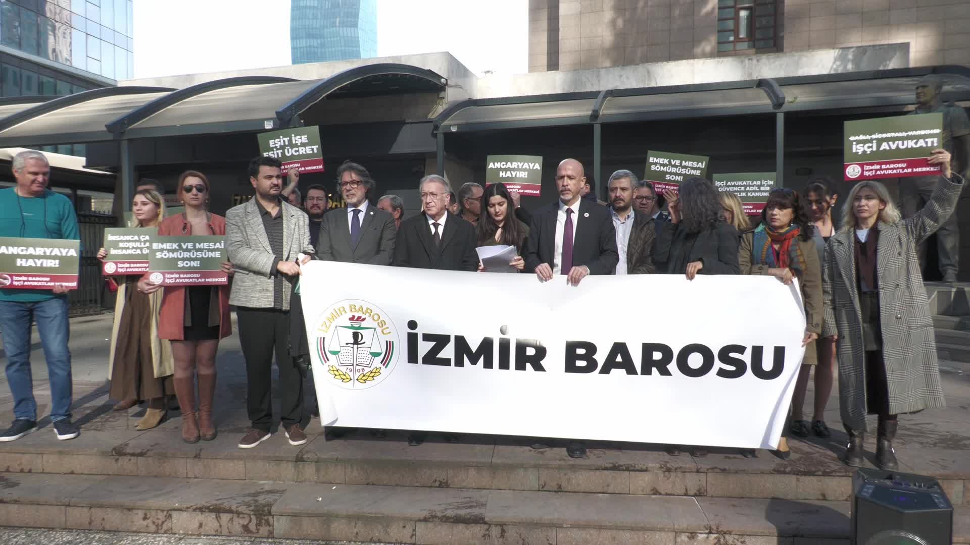 İzmir Barosu üyesi avukatlar, İzmir Adliyesi önünde bir araya gelerek işçi avukatların yaşadığı düşük ücret, güvencesizlik ve mevzuata aykırı çalışma koşullarına dikkati çekti.