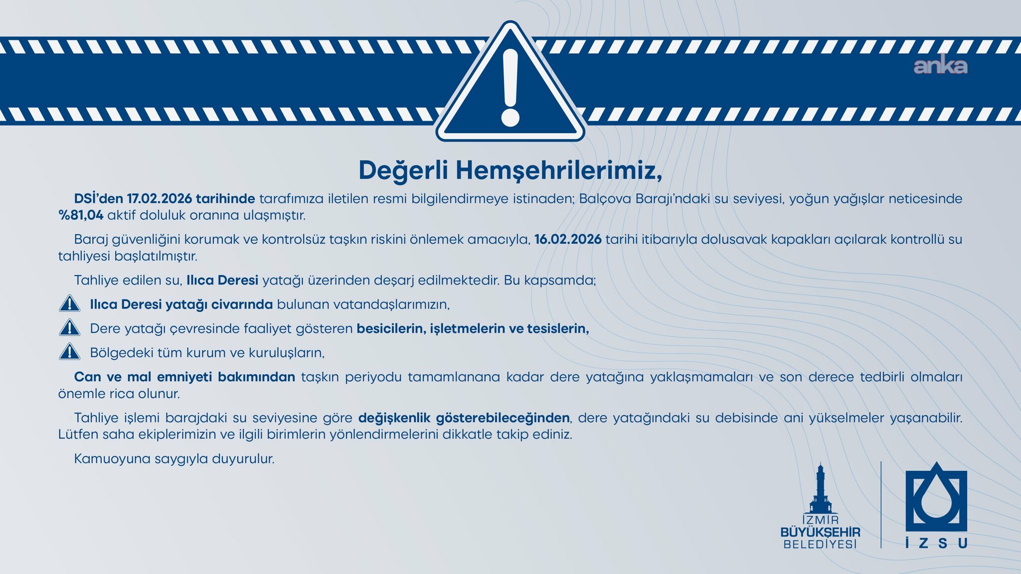 İZSU’dan yapılan açıklamada, tahliye edilen suyun Ilıca Deresi yatağı üzerinden deşarj edildiği belirtildi. Açıklamada, Ilıca Deresi yatağı civarında bulunan vatandaşların, dere yatağı çevresinde faaliyet gösteren besicilerin, işletmelerin ve tesislerin, ayrıca bölgedeki tüm kurum ve kuruluşların taşkın periyodu tamamlanana kadar dere yatağına yaklaşmamaları ve tedbirli olmaları istendi.
