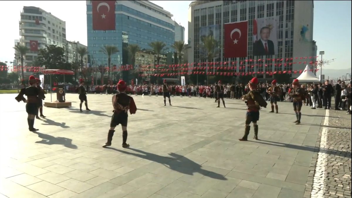 Vali Elban, Orgeneral İrfan Özsert ve İzmir Büyükşehir Belediye Başkanı Tugay’ın halkı selamlamasıyla başlayan kutlamalar, Ege Üniversitesi halk oyunları ekibi gösterisi ile devam etti.