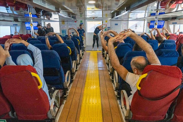 İzmir Büyükşehir Belediyesi, Avrupa Spor Haftası etkinlikleri kapsamında deniz yolculuğunu daha keyifli hale getirmek için vapur egzersizleri programı başlattı. Her pazartesi ve çarşamba günü sabah seferlerinde orta yoğunluklu hatlarda yapılan etkinlikte yolcular yerlerinden kalkmadan egzersizlere katılabiliyor.