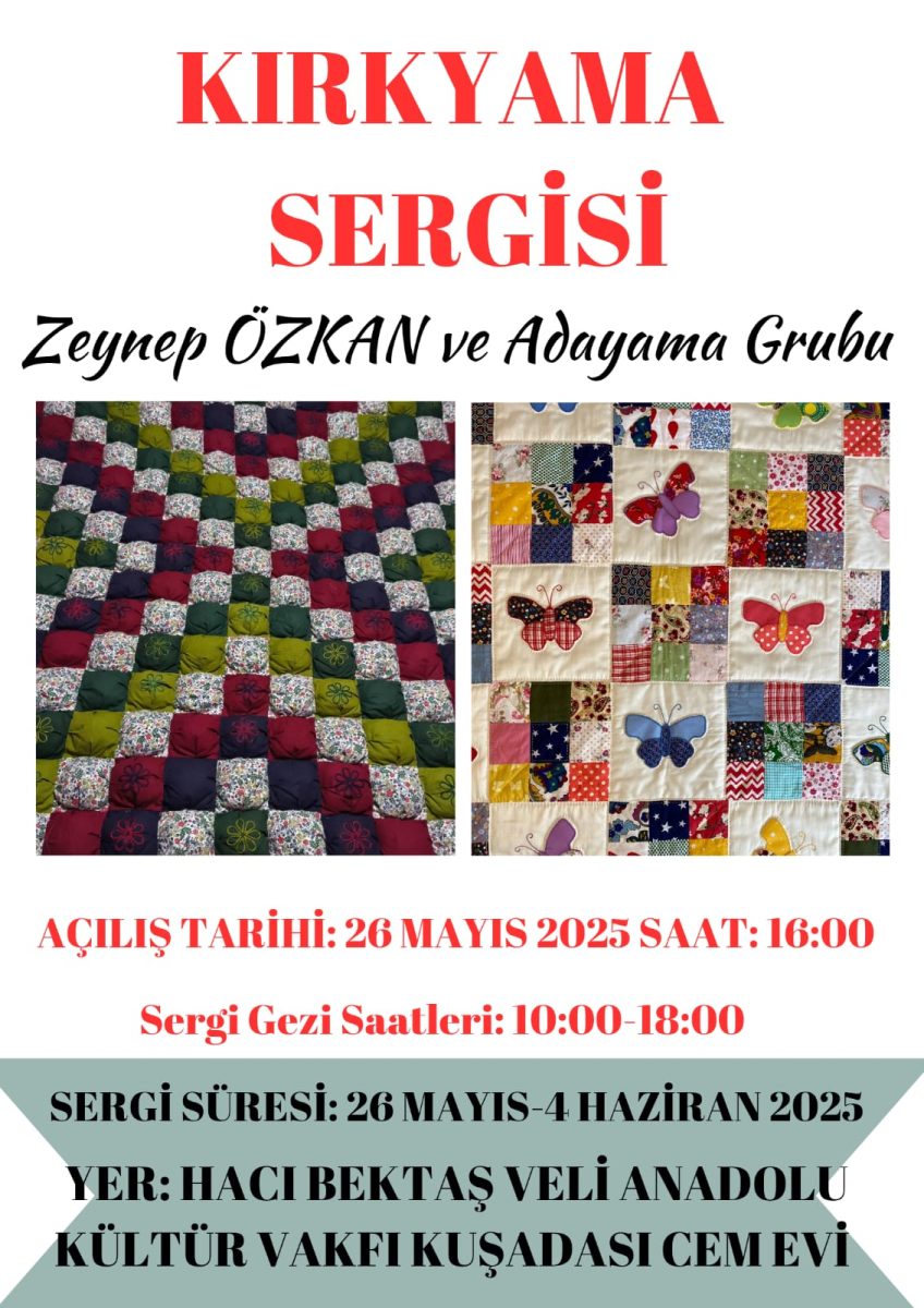 26 Mayıs – 4 Haziran 2025 tarihleri arasında açık olacak sergi, kadın girişimciliğinin, yaratıcı el sanatlarının ve toplumsal dayanışmanın en güzel örneklerinden birini sunacak. El ve makine dikişiyle kırkyama (patchwork) tekniklerini buluşturan ekip; çanta, kırlent, dekoratif örtüler, giysiler ve duvar panoları gibi birçok eşsiz tasarımla ziyaretçileri karşılayacak.