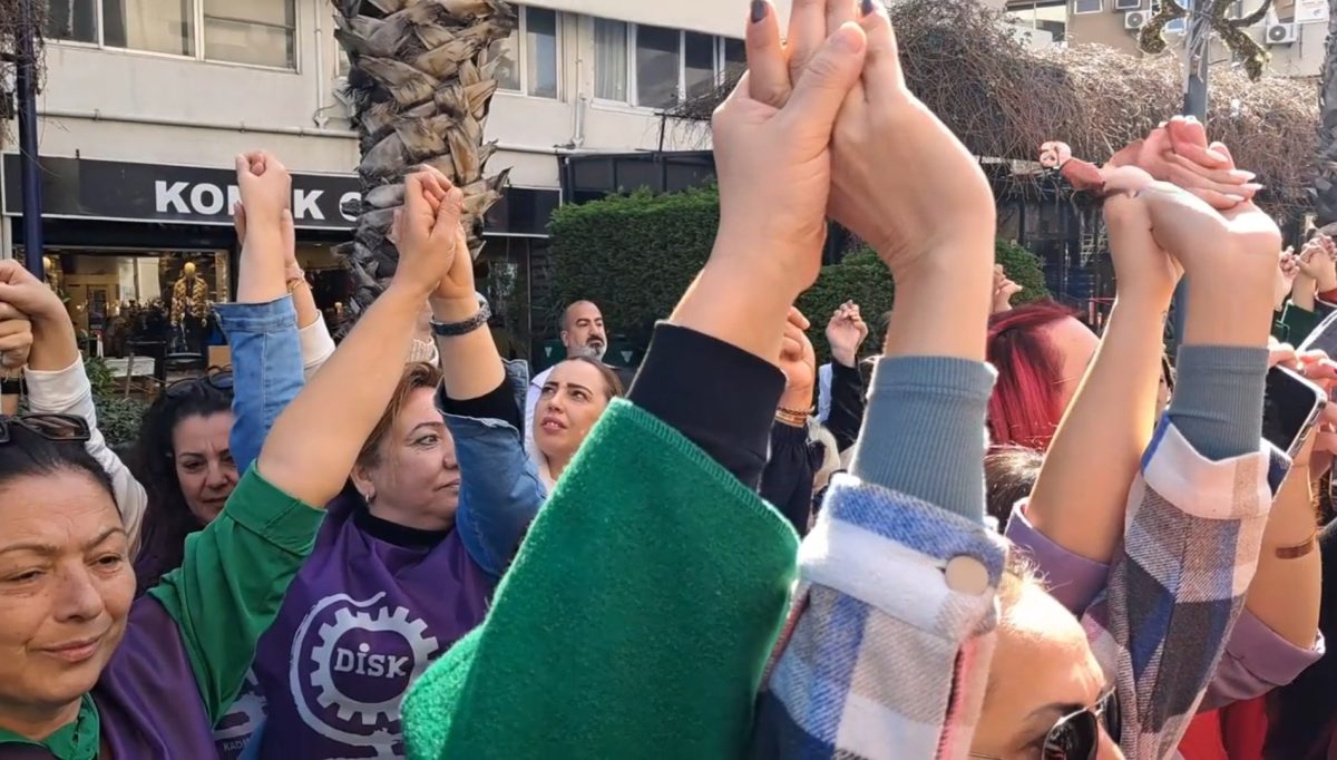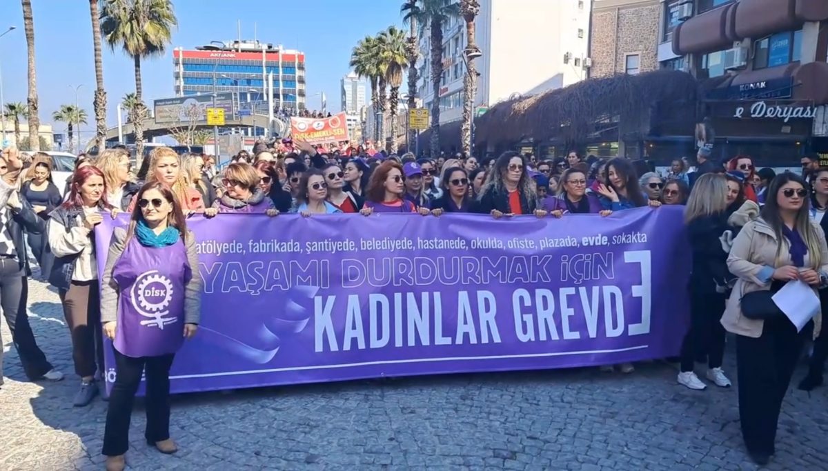 Hatice Zeybek Haberi/İzmir – 8 Mart Dünya Emekçi Kadınlar Günü kapsamında iş bırakan Devrimci İşçi Sendikaları Konfederasyonu (DİSK) üyesi kadın işçiler, Konak’ta bir araya gelerek yürüyüş düzenledi. Kadınlar, düşük ücretler, güvencesiz çalışma koşulları ve toplumsal cinsiyet eşitsizliğine karşı taleplerini dile getirdi.
