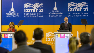 İzmir Büyükşehir Belediye Başkanı Tunç Soyer, İzmir’i sadece kültürü tüketen değil üreten bir şehir haline getirme hedefiyle yola çıktıklarını belirterek “İzmir Kültür Fonu (İzKF) projesi, özünde kültür üreten bir kent amacı taşıyor. Aynı zamanda bu kütür üretimine vatandaşların katılımını sağlamayı ve herkesin kültüre erişimini mümkün kılmayı amaçlıyor” dedi.