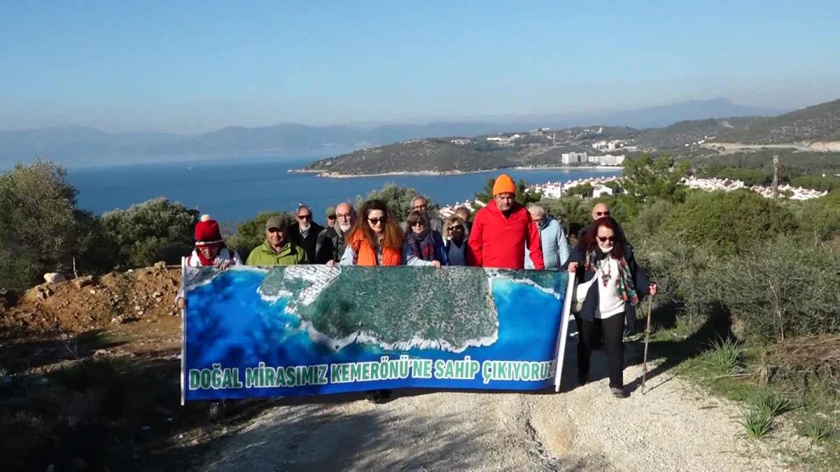 Kuşadası’nda çevreci dernekler, yapılaşmaya açılmak istenen mülkiyeti Maliye Hazinesi’ne ait Türkmen Mahallesi’ndeki Kemerönü mevkiini korumak amacıyla bir kez daha harekete geçti. Bu kapsamda aralarında Kuşadası Kent Konseyi üyelerinin de bulunduğu çevreci derneklerin temsilcileri ve doğaseverler, Kuşadası Sivil Toplum Platformu çatısı altında birleşerek, Kemerönü mevkiinin girişinde bir araya geldi. Farkındalık oluşturmak için eğimli arazide yaklaşık 2 kilometrelik yürüyüş ve tırmanış yapan çevreciler, bölgenin tepe noktasına ulaştıktan sonra basın açıklaması yaptı.