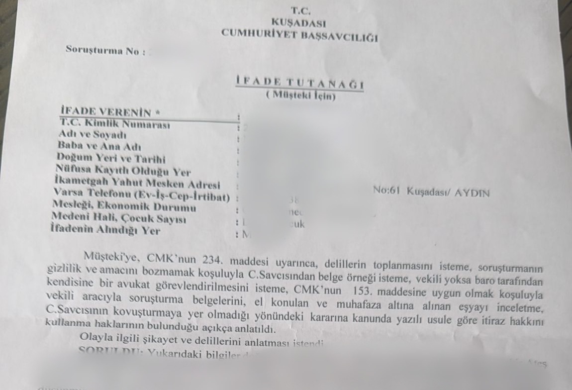 Soruşturma süreci devam ederken; masumiyet karinesi gereği isimler gizli tutuldu. Haber, olayın Kuşadası Cumhuriyet Başsavcılığı’na intikal etmiş olması ve olası mağduriyetlerin önlenmesi amacıyla kamu yararı gözetilerek hazırlandı. İfade tutanağı ve başvuruya ilişkin belge tarafımızda bulunduğu karşı tarafada bildirildi.