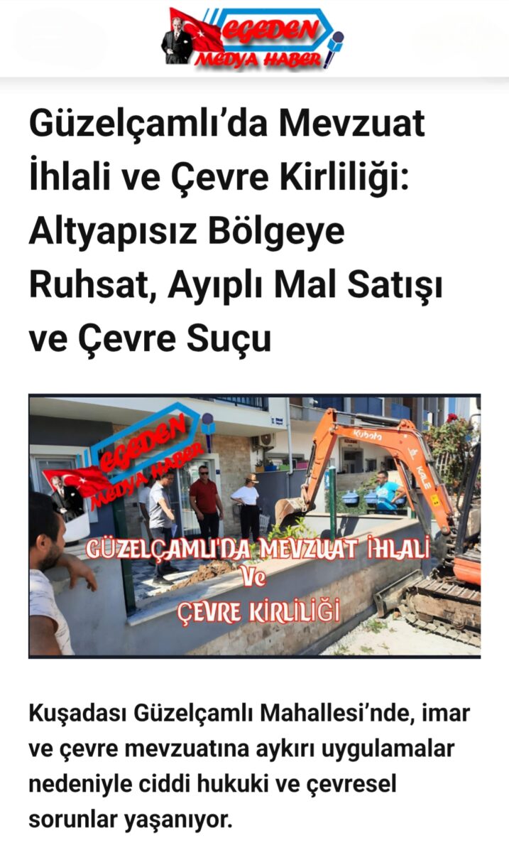 Egeden Medya Haber’de 01 Temmuz 2025 tarihinde “Güzelçamlı’da Mevzuat İhmali” başlığıyla yayımlanan haber, Kuşadası’nın Güzelçamlı Mahallesi’nde bazı yapılaşmalarda ciddi hukuki ve çevresel sorunlar bulunduğunu ortaya koymuştu.