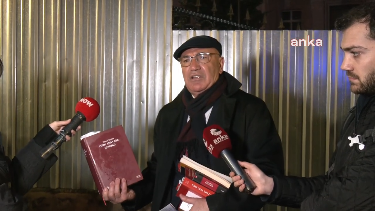 “Şimdi yağmur yağıyordu. Ben tabii ki burada tutuklu bulunan gençler ve öğrenciler için yapılan hukuksuz yargılamalar ve cezaevine atıldığı için en azından bu hukuksuzluğu Adalet Bakanlığı’na duyurabilmek için demokratik hak olan, tek başıma burada yağmurda ıslanmamak için o çadırı ben kurdum ve çadırın üzerinde şu iskemleyi getirip bu kanun kitaplarını getirdim. Bunların ıslanmaması için ve ıslanmamak için kurduğum çadırı emniyet çekti, kırıldı. Netice itibarıyla arabama koydum. Yani şu anda çadırın olmamasının nedeni bu. Zaten gördüğünüz bu kanun kitaplarının buraya çıkarılmasından bile rahatsız oldular. Yani Türkiye hukuk devleti değil mi, kanundan niye korkuluyor? Bu kanunlar yasadışı değil, kaçak değil. Meclis’te çıkartılan kanunlar maalesef suç unsuru haline gelmiş durumda.”