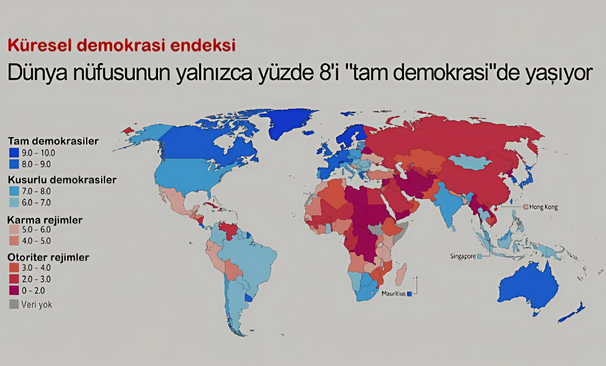 Londra’da yayınlanan liberal görüşlü haftalık haber, uluslararası ilişkiler ve ekonomi dergisi The Economist, dünyadaki 167 ülkenin demokratik yapılarını beş temel kategoride ölçmüş. Bu kategoriler şunlar: