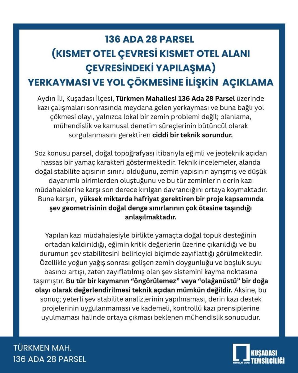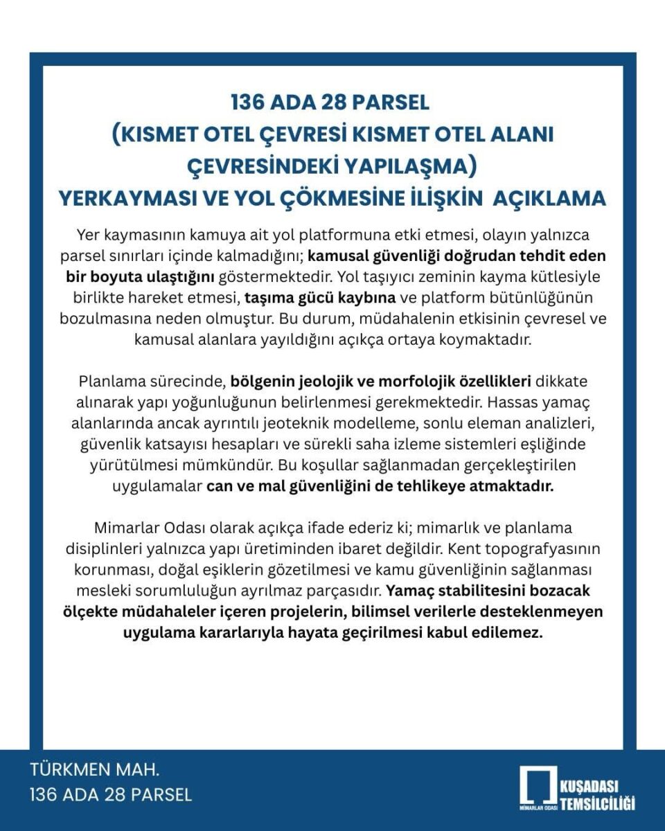 Olayla ilgili Mimarlar Odası tarafından yapılan açıklamada, yaşanan durumun basit bir zemin problemi olmadığı, planlama, mühendislik ve denetim süreçlerinin topyekûn sorgulanmasını gerektiren ağır bir teknik ihlal olduğu vurgulandı.