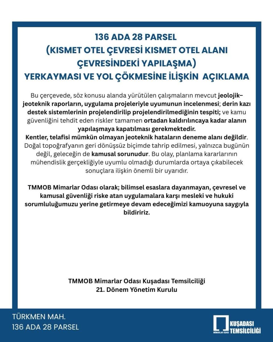 Açıklamada, Kuşadası Belediyesi, Aydın Büyükşehir Belediyesi ve Aydın Valiliği’ne açık çağrı yapılarak, bu ölçekte bir risk karşısında sessiz kalmanın görev ihmali anlamına geleceği vurgulandı.