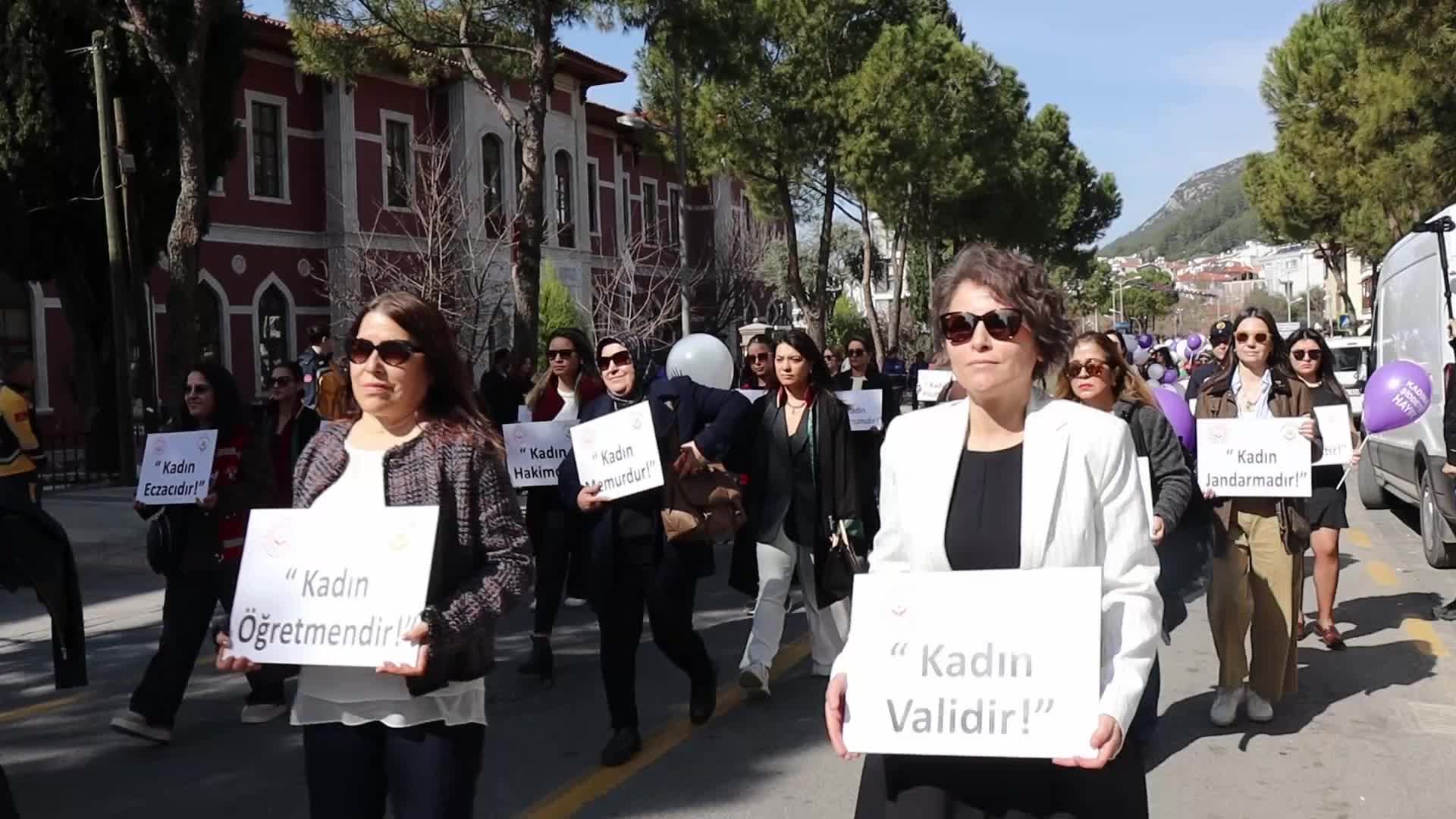 Muğla Aile ve Sosyal Hizmetler İl Müdürlüğü’ne bağlı Şiddet Önleme ve İzleme Merkezi (ŞÖNİM) koordinasyonunda, Muğla Büyükşehir Belediyesi ile Menteşe Belediyesi’nin iş birliğinde gerçekleştirilen yürüyüşe kamuda görev yapan kadın hakim, savcı, avukat, doktor, öğretmen, belediye başkanı ve idareciler meslek kıyafetleriyle katıldı.