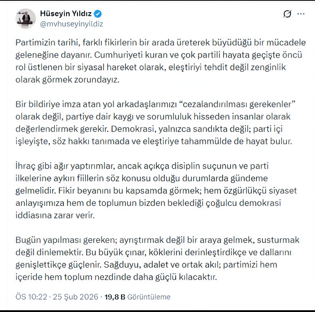 CHP Aydın Milletvekili Hüseyin Yıldız, bugün bir bildiriye imza atan partililerin disiplin kurulu kararıyla ihraç edilmesine tepki gösteriyor.