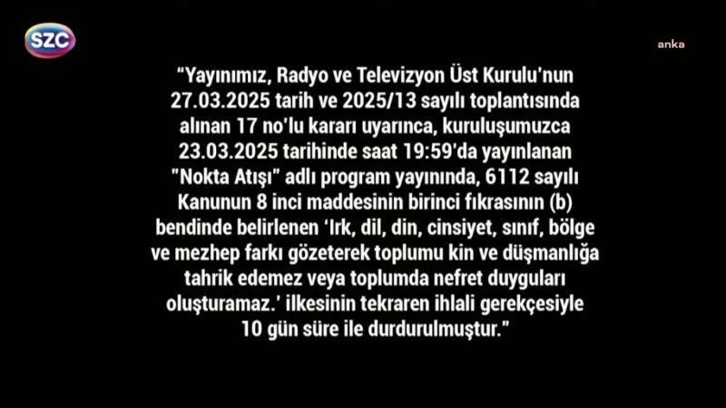 “Yayınımız, Radyo ve Televizyon Üst Kurulu’nun 27.03.2025 tarih ve 2025/13 sayılı toplantısında alınan 17 no’lu kararı uyarınca, kuruluşumuzca 23.03.2025 tarihinde saat 19:59’da yayınlanan “Nokta Atışı” adlı program yayınında, 6112 sayılı Kanunun 8 inci maddesinin birinci fıkrasının (b) bendinde belirlenen ‘Irk, dil, din, cinsiyet, sınıf, bölge ve mezhep farkı gözeterek toplumu kin ve düşmanlığa tahrik edemez veya toplumda nefret duyguları oluşturamaz.’ ilkesinin tekraren ihlali gerekçesiyle 10 gün süre ile durdurulmuştur.”